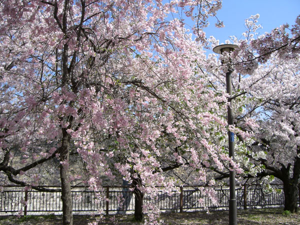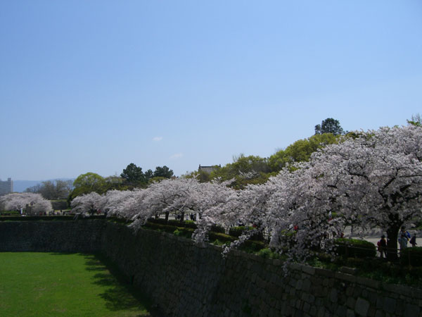 石垣が見えないくらい、桜並木のさくらが満開です。
