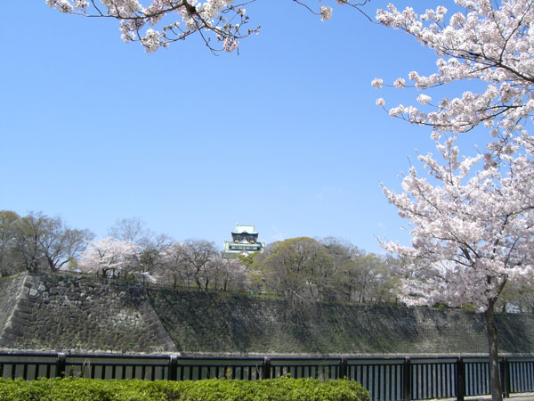 東外堀横の歩道沿いも桜並木になってるので綺麗です。ここはバーベキューも可能地域となっているのでかなり賑わっていて炭火焼の匂いが漂っています。 大阪城の東側からは天守閣が少し眺めることが出来ます。