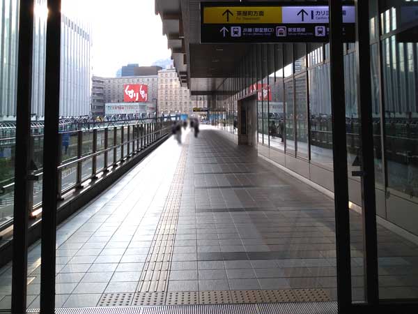 7.建物から出て、壁沿いのスロープ(歩道橋)を歩いていきます。 (左側には道路を挟んでヨドバシカメラが見えます。)
