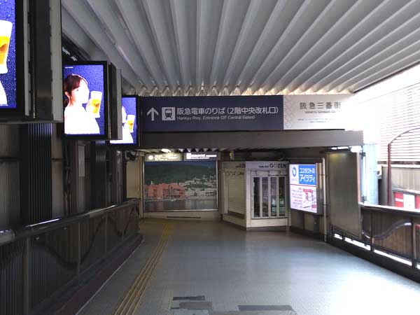 9.阪急三番街南館の2階フロアをそのまま奥へ(阪急電車の2階改札方向へ)進んで行くと阪急電車の改札前まで行けるので、この近くの階段等で1階に降ります。