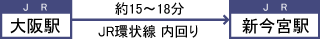 JR(大阪駅―新今宮駅_15~18分)約190円(JRの路線図)