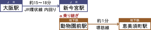 2.a.乗り継ぎ JR新今宮駅から地下鉄大阪メトロの堺筋線「動物園前駅」に乗り換えます。徒歩約2~3分です。