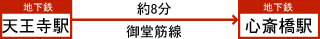 [ 天王寺駅から心斎橋駅まで約8分 料金:約240円 乗り換え:0回 乗車時間:約8分 ]