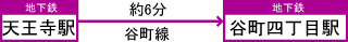 [ 天王寺駅から谷町四丁目駅まで約6分 料金:約240円 乗り換え:0回 乗車時間:約6分 ]