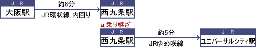 [ 大阪駅からユニバーサルシティ駅まで約12~14分 料金:約190円 乗り換え:1回 乗車時間:約11分 ]