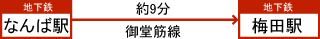 [ なんば駅から梅田駅まで約9分 料金:約240円 乗り換え:0回 乗車時間:約9分 ]