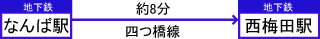 大阪メトロ四つ橋線(なんば駅―西梅田駅_8分)約240円(地下鉄の路線図)