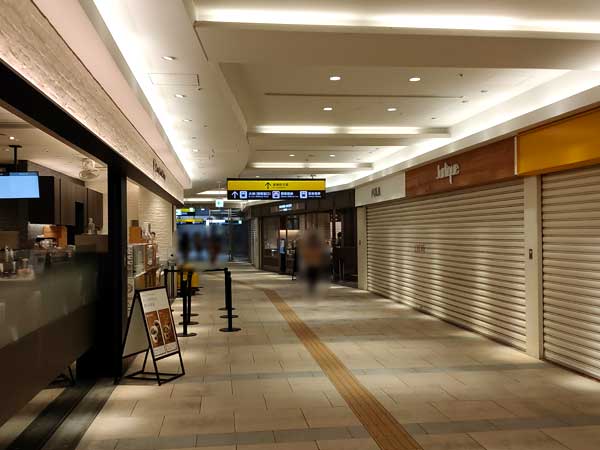 3.連絡通路を進んで行くと、左側には飲食店などが集まるフロア、右側にはコンビニが見えてきます。さらに進んで行くと左右に通路が分かれるので、ここを右に行きます。