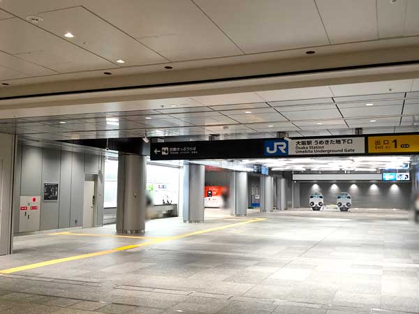 〇JR大阪駅の地下改札は、地下1階の「うめきた地下口」の1か所です。(従来の改札は、1階に御堂筋口・中央口・南口・桜橋口・西口(新設)・(エキマルシェ大阪口)と3階の連絡橋口があります。)
