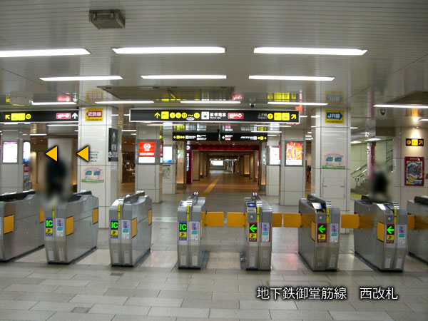谷町線の南・北改札から出て地下街を抜けて行くルートや、谷町線と改札内の連絡通路で繋がってる御堂筋線側の西改札から行くルートなど行き方はいろいろありますが、 ここでは改札内の連絡通路を抜けて、御堂筋線の西改札を利用する行き方をご紹介しています。