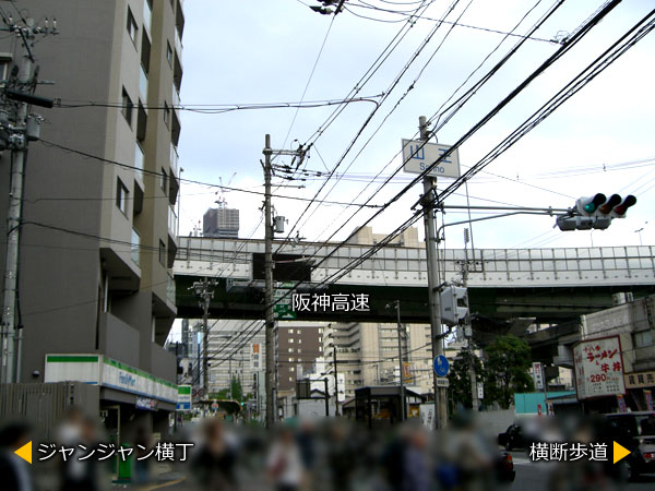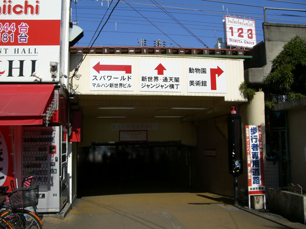 5A.高架を越えると正面に細長いアーケードの商店街がありますが、ここがジャンジャン横丁です。(左側に階段がありますが、改札から左へ行くルートはここを通ってくることになります。) この商店街を抜けると通天閣が見えてきます。