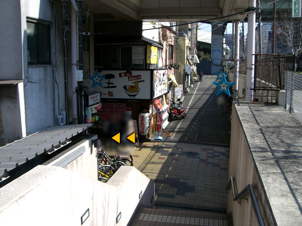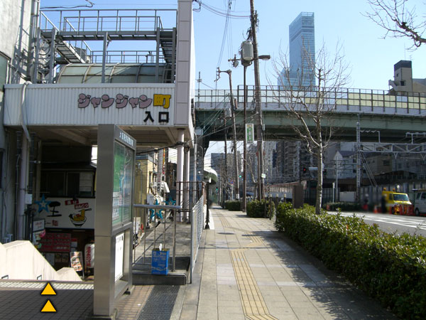 4B.階段を降りると左に商店街のジャンジャン横丁があります。ジャンジャン横丁を抜けて少し歩くと通天閣が見えてきます。 (ちなみに階段を降りた右には高架下の通路があり、新今宮駅から右に行くルートはここを通ってきます。) この左ルートは高低差があって少し戸惑うかもしれません。右ルートだとジャンジャン横丁まで高低差はほとんどないです。