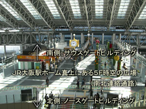 JR大阪駅ホームの真上にあるを南北を繋ぐ「時空の広場」(5F連絡通路)から南側のサウスゲートビルディング行くと大丸百貨店の6階入り口に繋がっています。