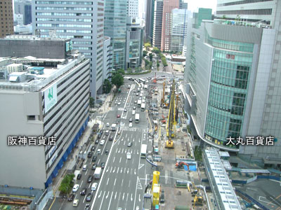 阪神百貨店は、JR大阪駅の南側方面にあり、大丸百貨店と幹線道路を越えた先に「阪神百貨店」があります。 阪神百貨店は、幹線道路沿いにあるので歩道橋も用意されていますが、広大な梅田地下街にも繋がっているので、地下から行くのが便利です。