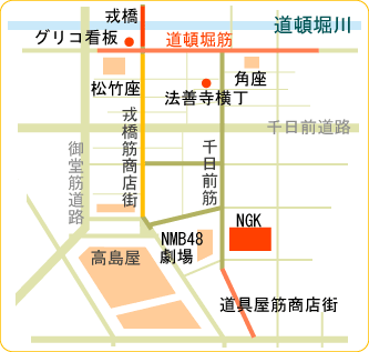 [ 戎橋筋商店街 : 千日前 : 法善寺横丁(千日前) : なんばグランド花月(千日前) : 道具屋筋商店街 : でんでんタウン : なんばパークス : なんば地下街 : スポットまでの行き方 ]