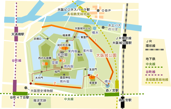 最寄り駅の谷町4丁目駅から大阪城公園の南西入口までの行き方の詳細はこちらのページです。