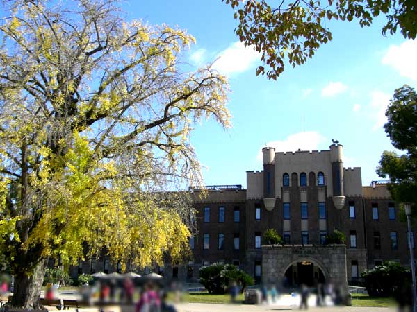 大阪城公園内には、約1km以上続く長いイチョウ並木があります。(広めの歩道で、両側にイチョウが並んでいます。)