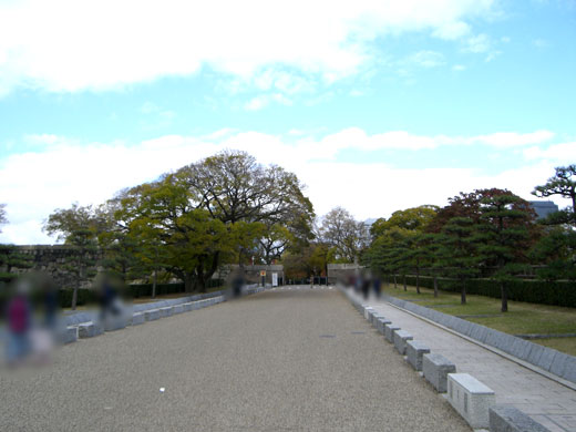 6.イチョウ並木を進んで行き、大阪城の裏門(北側)の青屋門まできたら、まだイチョウ並木の途中ですが外堀を渡り天守閣の方へと向かいます。