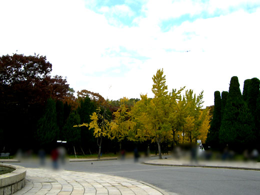 5.噴水を左に曲がります。ここから1の「イチョウ並木」が始まります。(イチョウが黄金色に紅葉しているのですぐにわかると思います。)