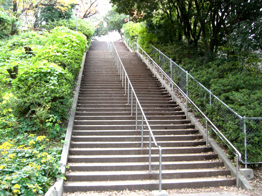 2.南外堀を端まで進むと左(堀沿い)に行きます。すこし歩くと玉造門へと続く大きな道に出てくるのですが、この道には行かず更に進んで行くと長い下り階段が見えてきます。