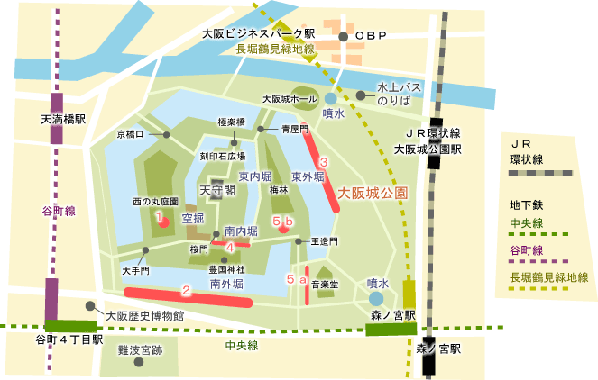2の「南外堀」の最寄り駅は谷町4丁目駅です。大阪城公園に入って少し東に歩くと南外堀です。駅から約6~8分。