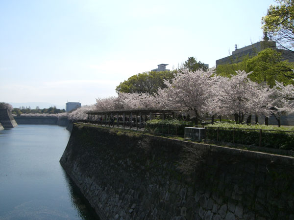 東外堀横の歩道沿いも桜並木になってるので綺麗です。ここはバーベキューも可能地域となっているのでかなり賑わっていて炭火焼の匂いが漂っています。 大阪城の東側からは天守閣が少し眺めることが出来ます。