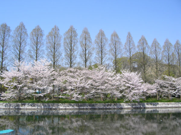 東外堀の南から北を見た写真です。東外堀の外側の方には、桜の木が並んでいます。本丸のある内側の方は、ポツリポツリとある感じです。