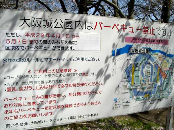 堀のすぐ横で水面と桜を眺めながらの宴会は楽しそうです。ここはバーベキューも可能地域となっています。