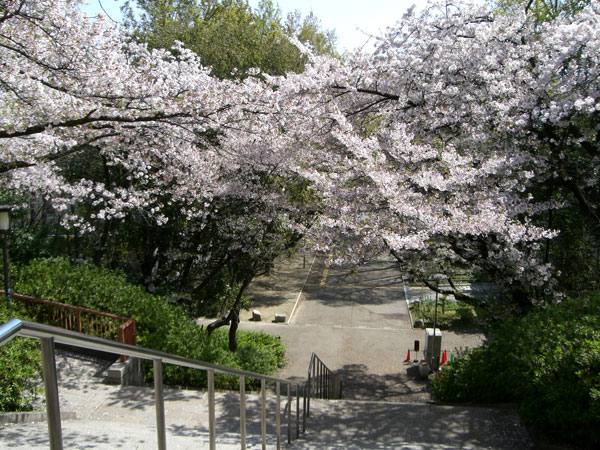 メインの通りではないので平日の日中はゆっくり桜散策ができる歩道です。 歩道の東側は地形の関係で高低差があるため非常に長い階段となっています。