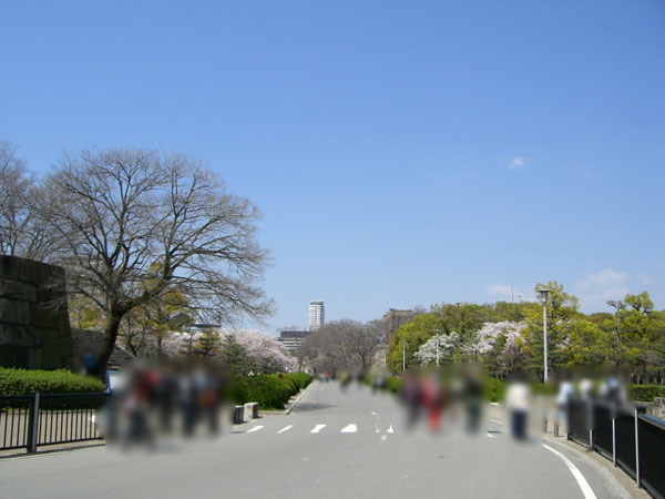 大阪城の正門となる「桜門」がある通りで、広い歩道沿いに桜の木が並んでいます。