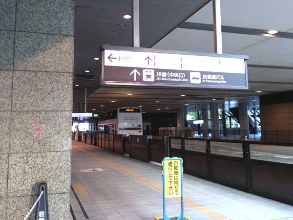 6.ルクアの入口が見える(西側)方向に進んでいきます。ルクアには入らずに、右横にある通路を進んでいきます。(高速バス専用の車道沿いの通路)