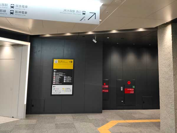 2.改札前のコンコースを右に進んで行くと、長い通路と繋がっていて、この右側に地上への出入口「JR大阪駅の西口」があるので、ここから地上に出ます。