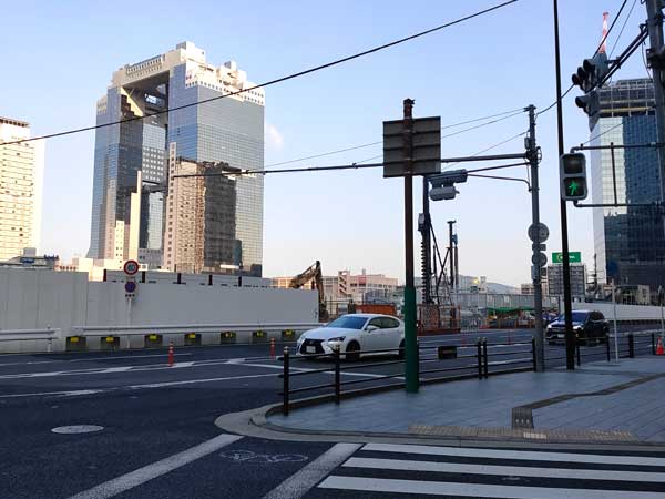7.JR高速バスターミナルを越えて大阪駅の北西の角まで来ると交差点があります。 (右斜め前方の先には、特徴的な梅田スカイビルが見えます。)
