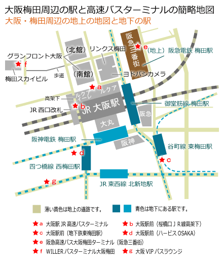 別ページ:[ JR大阪駅(1F)から・JR大阪駅(B1F)から・御堂筋線 梅田駅から・谷町線 東梅田駅から・四つ橋線 西梅田駅から ] 阪急高速バスターミナルまで