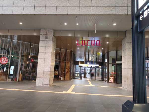 4.通路の先の正面には「ルクアイーレ」の出入口が見えます。このままルクアイーレの方に進んで行くと左右にエスカレーターが(地下簡略地図の「☆1」付近です)あるので、ここから地上1階に上がります。 (ちなみに地下通路はルクアイーレの前で左に曲がっていてルクアに繋がっています。)