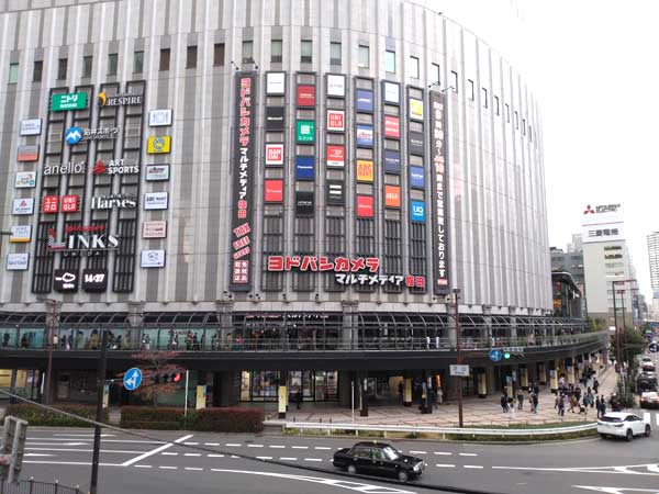 7.建物から出て、壁沿いのスロープ(歩道橋)を歩いていきます。 (左側には道路を挟んでヨドバシカメラが見えます。)