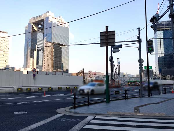 13.グランフロント大阪南館の角まで来ると交差点があるので、この交差点を左(梅田スカイビル方向)に渡ります。 (交差点の正面にあるビルは、グランフロント大阪の北館です。)