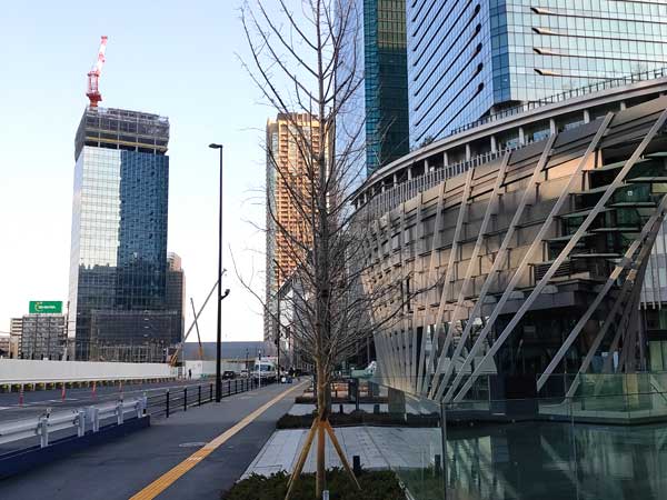 グランフロント大阪の南館を右に見ながら、この車道沿いの歩道を進んで行きます。