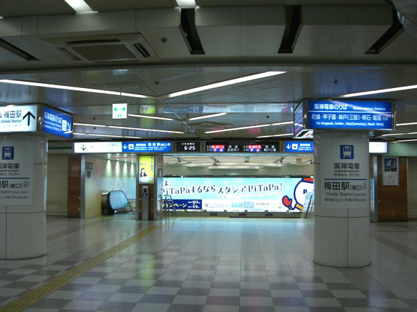 4.コンコースの前方には阪神百貨店の入口と阪神電車の地下2階への階段があります。